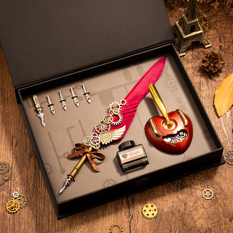 The Mechanical Heart Feather Pen Set is born from the romance of the Victorian industrial age and the elegance of classical calligraphy. Each pen is adorned with intricate gears and a winged motif, symbolizing both the precision of machines and the freedom of imagination.