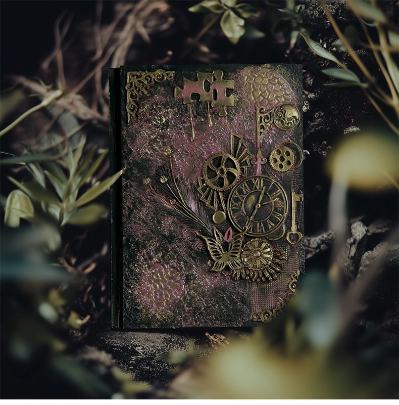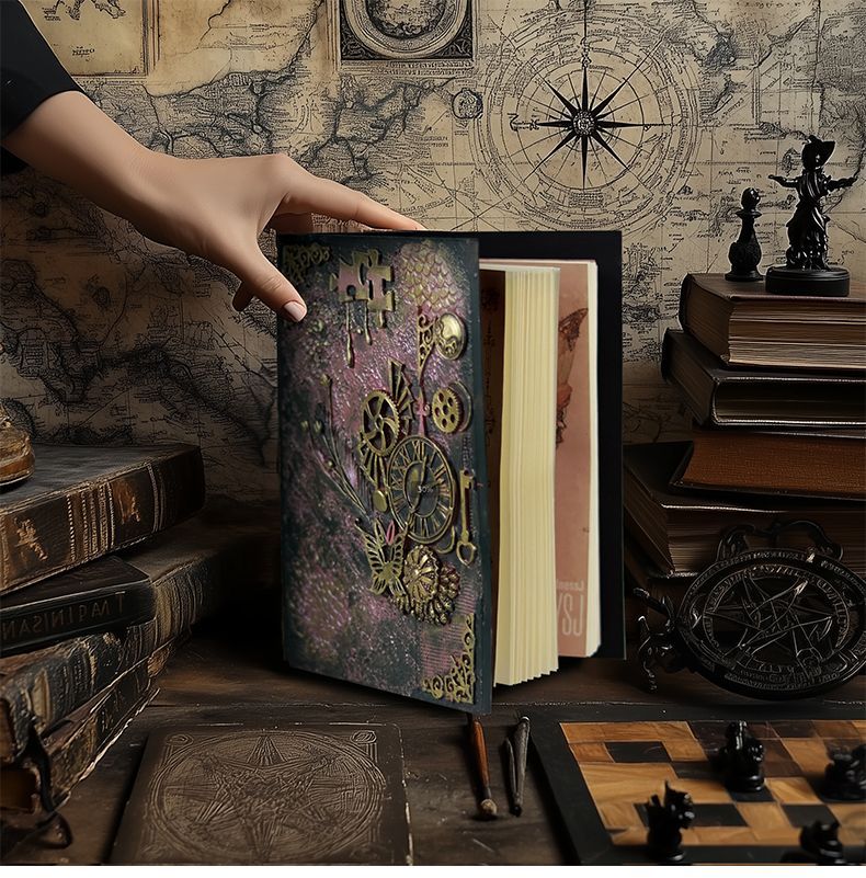 - ⚙ Intricate Steampunk Design – Handcrafted 3D resin-embossed cover adorned with gears, clock faces, keys, puzzle pieces, and butterflies, presenting the artistry of time and imagination.